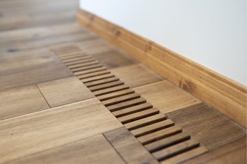 床との段差ができない、バリアフリータイプの木製床ガラリ。直線で構成されたシンプルなデザインのため、インテリア性を損なうことなく、床下の通気を確保することができます。